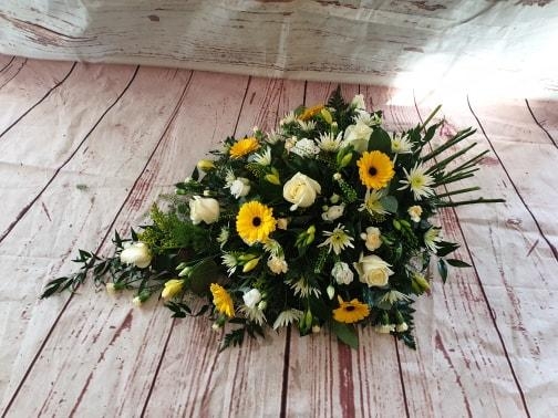 A single ended tear drop spray in yellow and whites to include roses, germini and freesia with a mixture of foliages